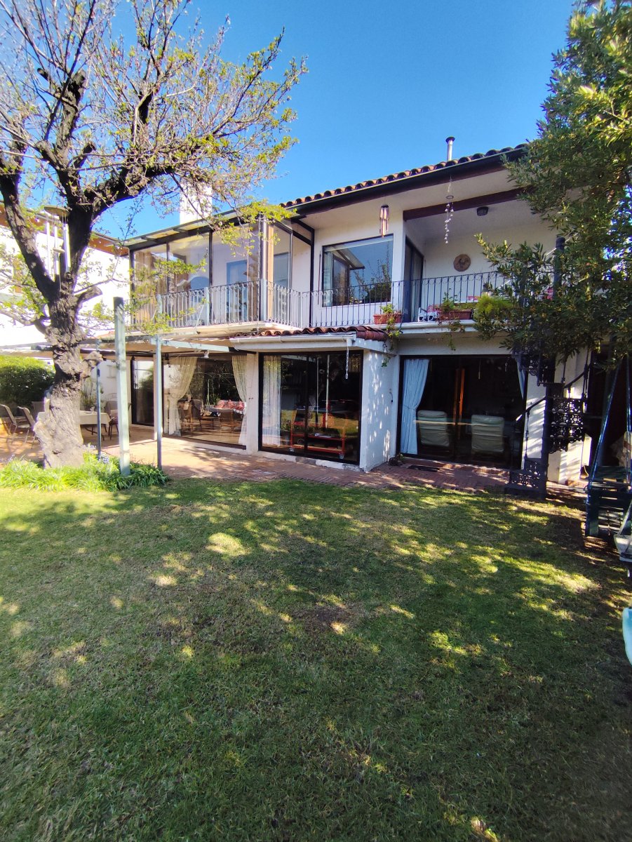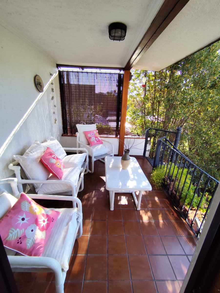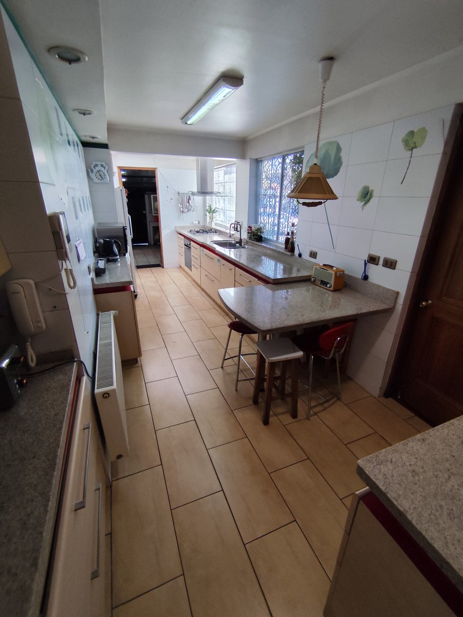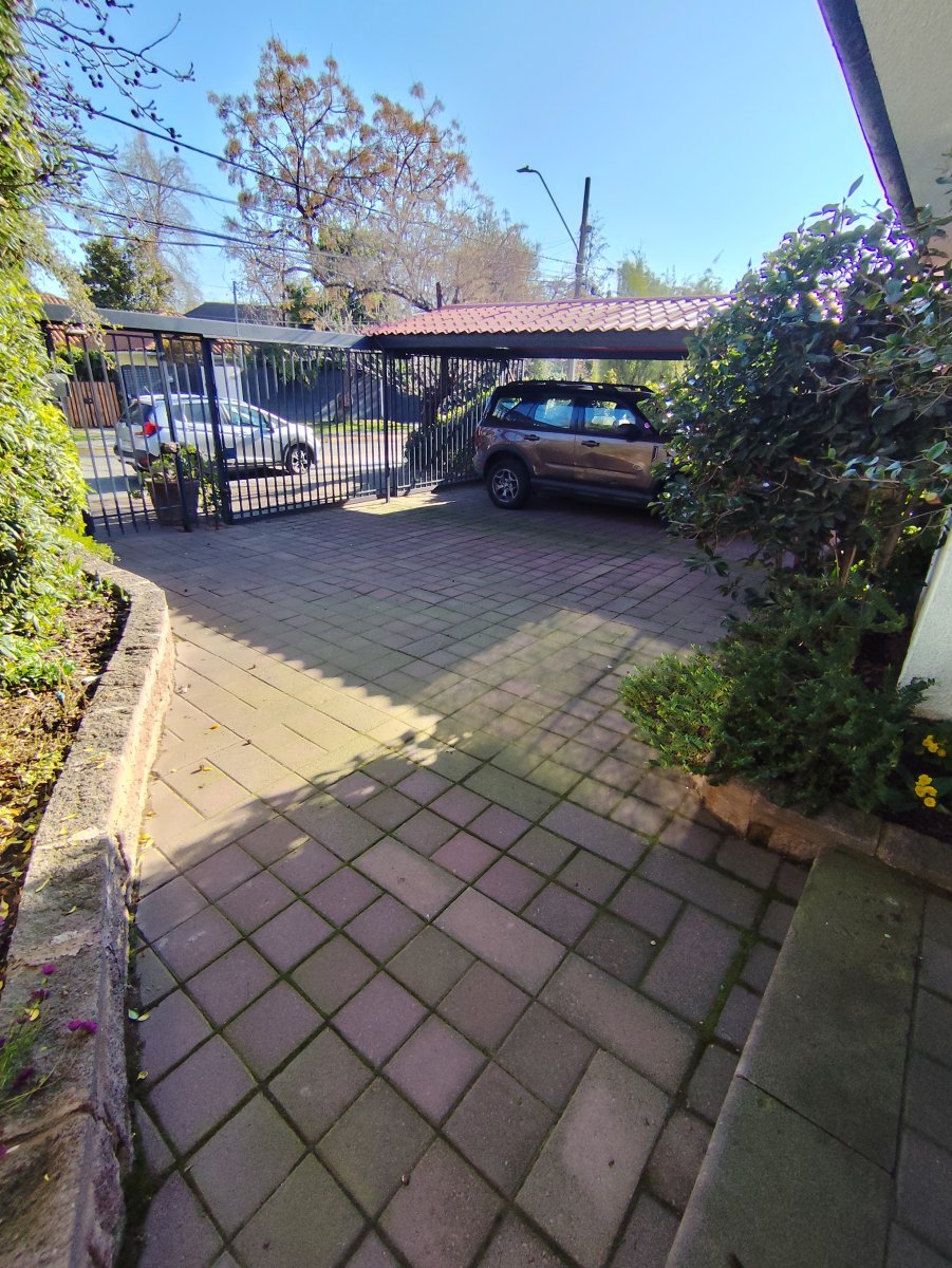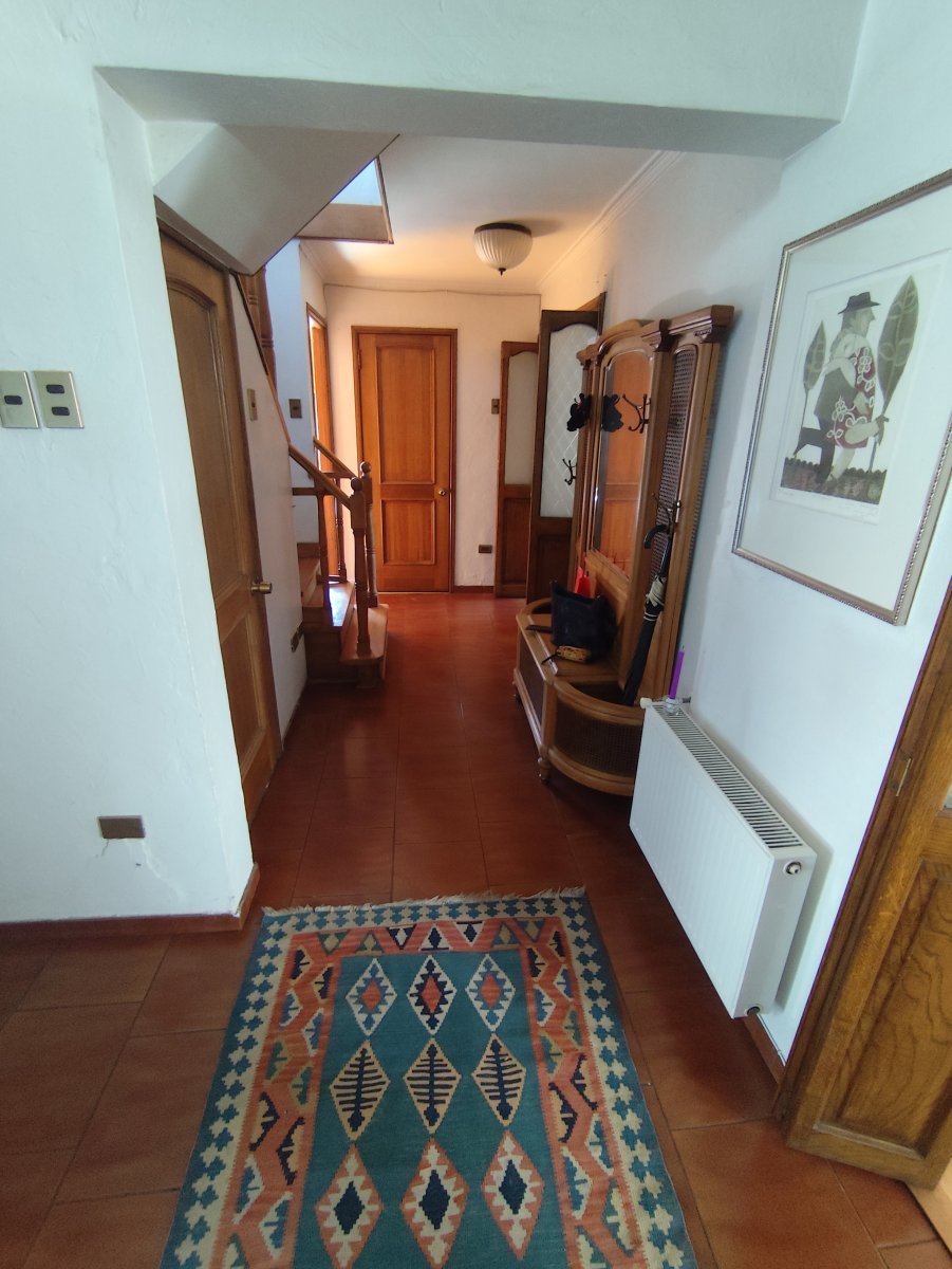 Casa aislada de dos pisos ubicada en un consolidado sector de Vitacura, sobre un terreno aproximado de 510 m² y una superficie construida de 216 m². Presenta una distribución funcional que en el primer piso integra hall de acceso, living comedor, cocina equipada con comedor de diario, logia en patio techado, un baño completo, baño de visitas, tres dormitorios, sala de estar y dormitorio más baño de servicio. La escalera de madera conduce al segundo piso, donde se encuentra un espacioso dormitorio principal con terraza cerrada, walk in closet y baño completo con jacuzzi, además de una sala de estudio o quinto dormitorio con amplio closet tipo bodega.