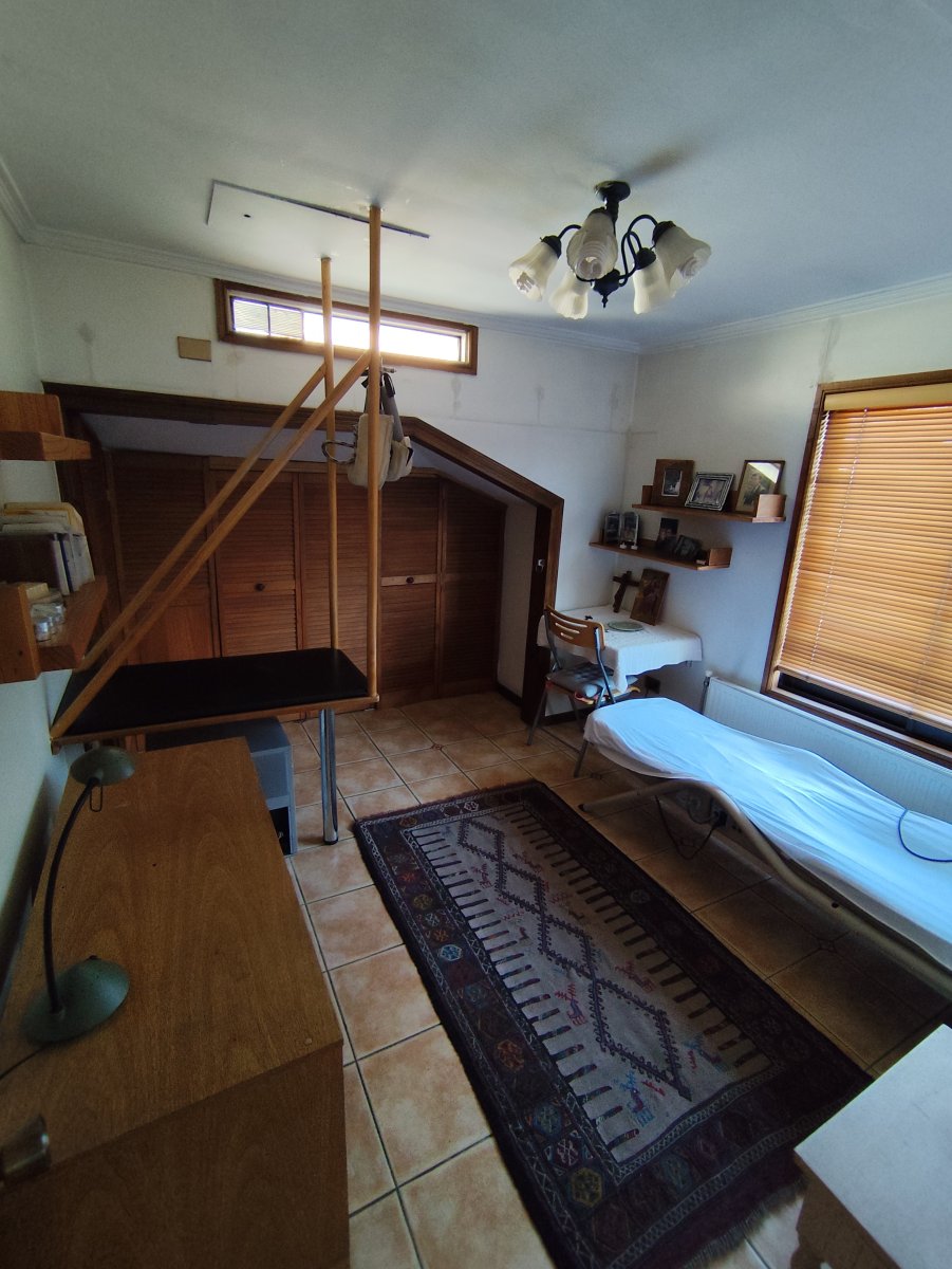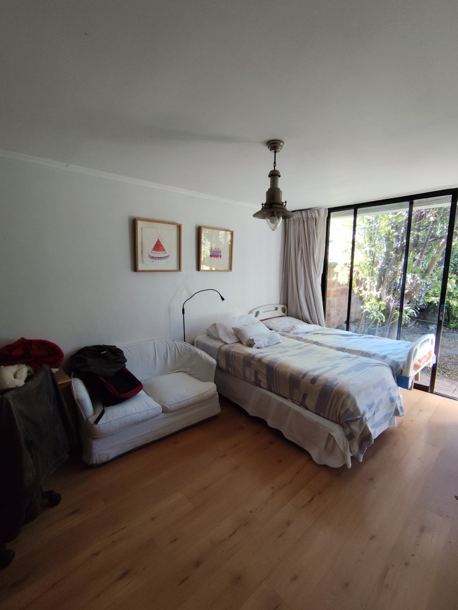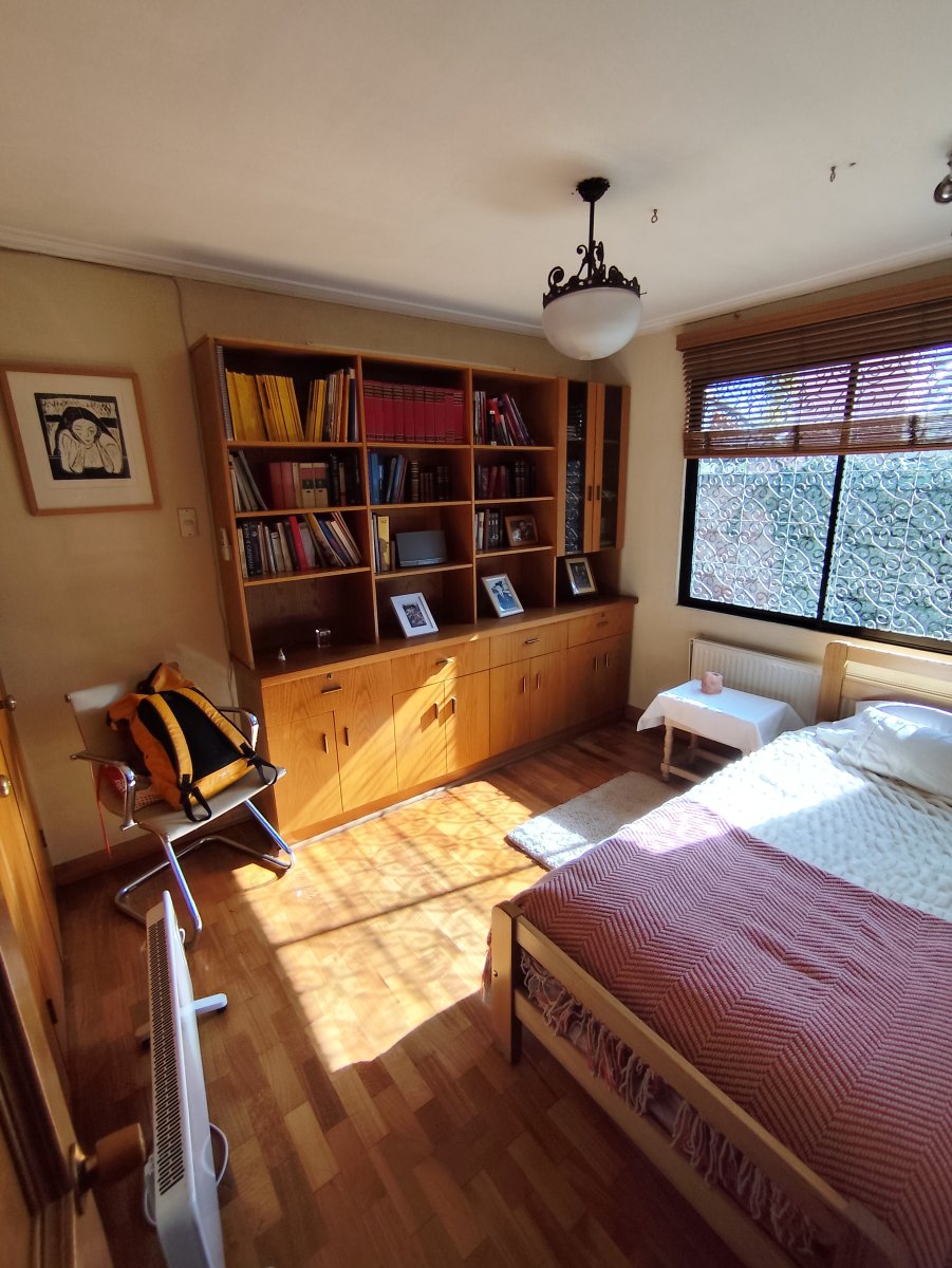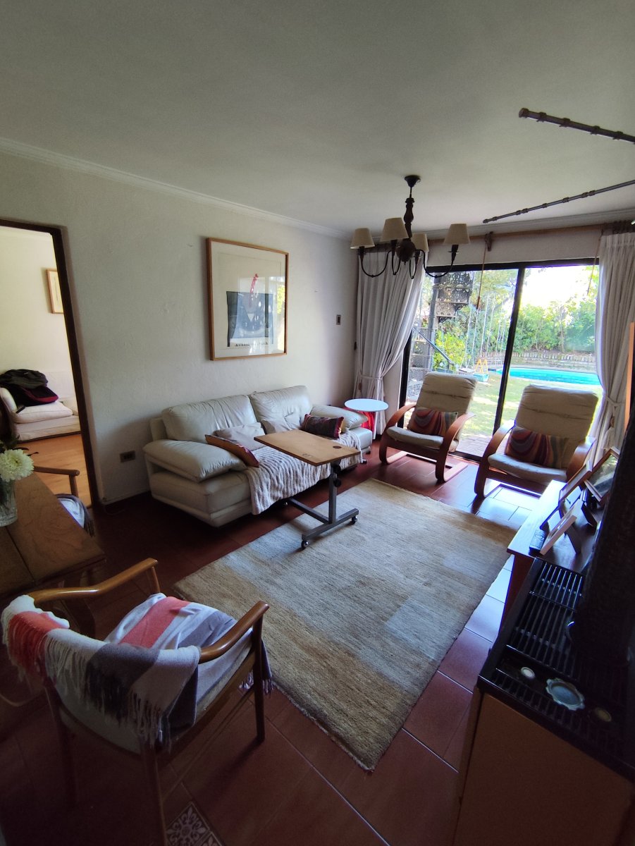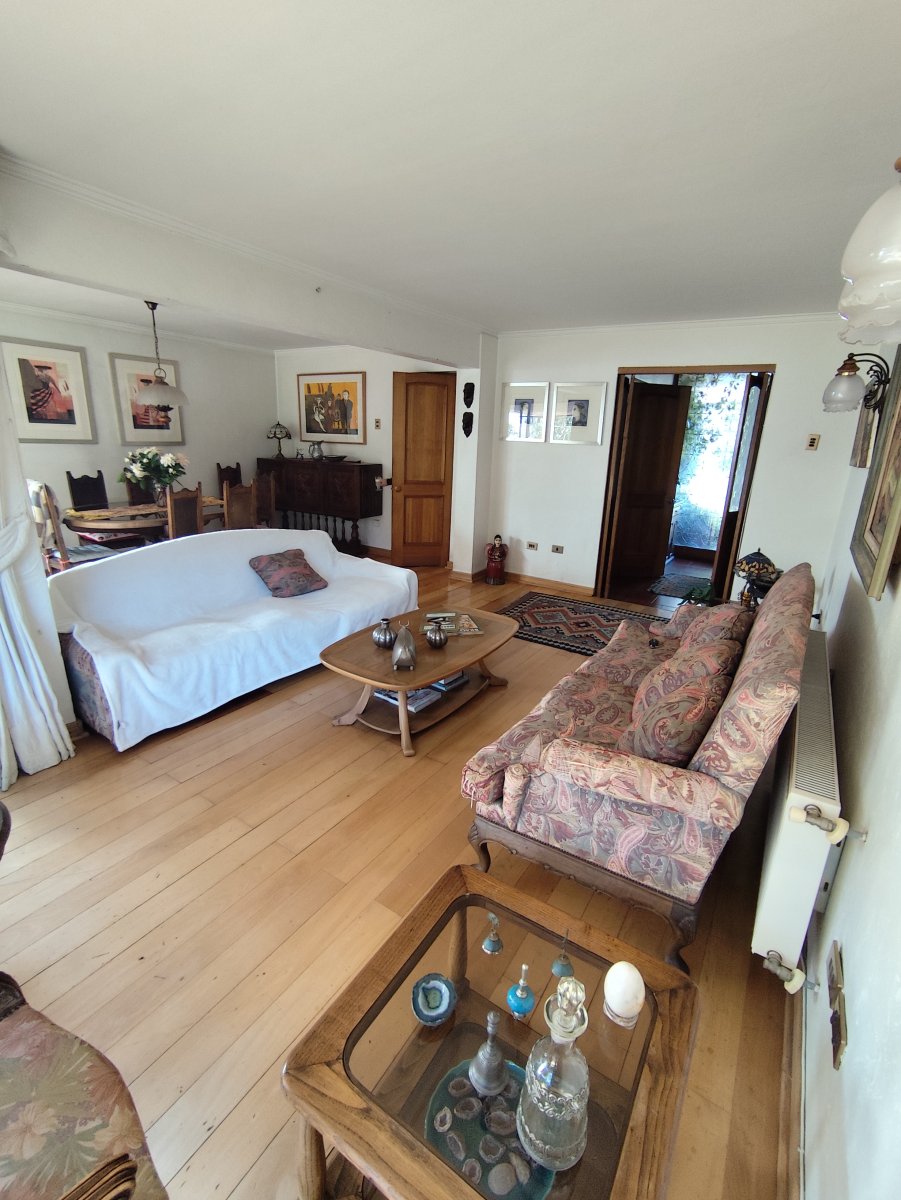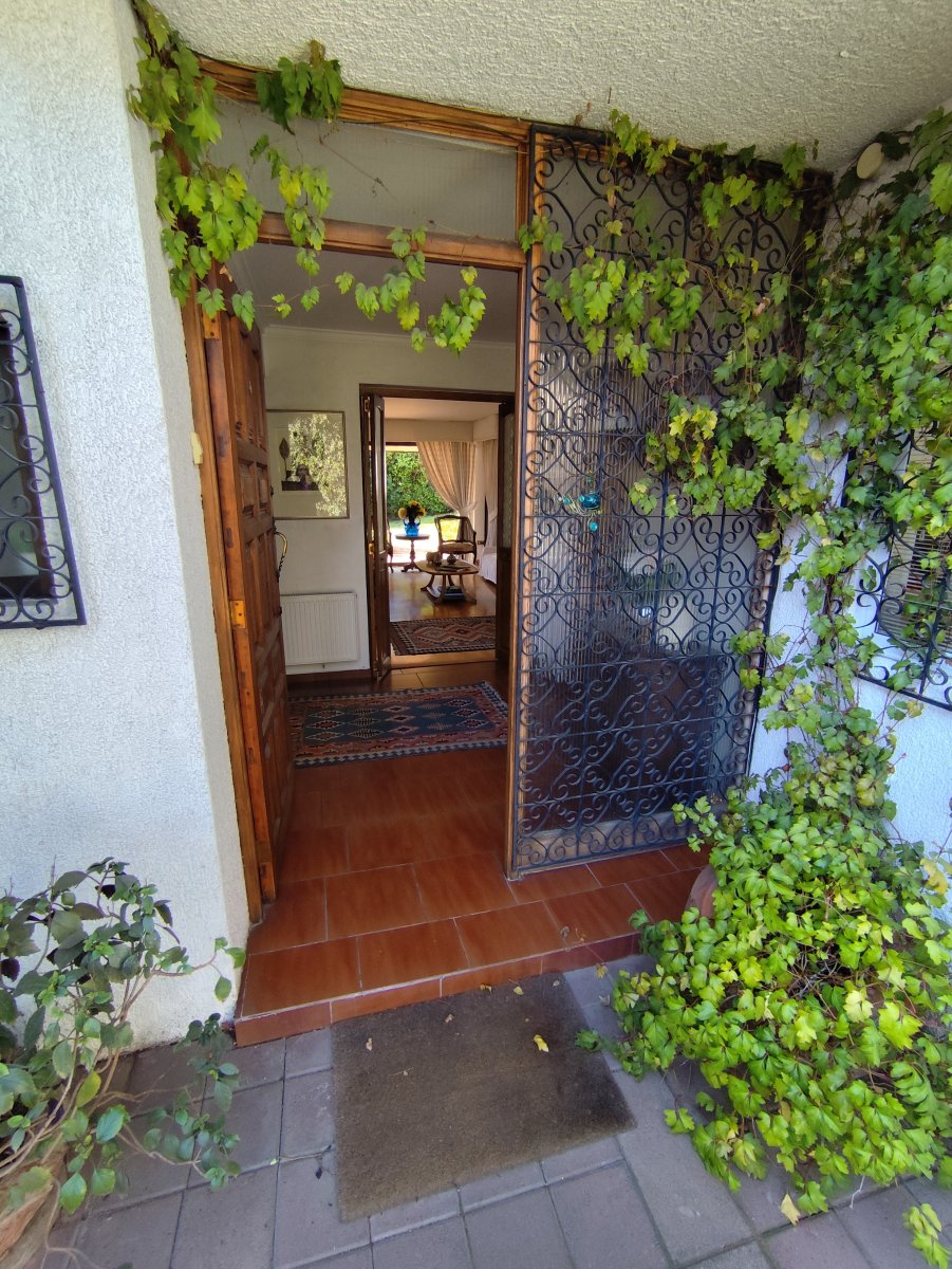 Casa aislada de dos pisos ubicada en un consolidado sector de Vitacura, sobre un terreno aproximado de 510 m² y una superficie construida de 216 m². Presenta una distribución funcional que en el primer piso integra hall de acceso, living comedor, cocina equipada con comedor de diario, logia en patio techado, un baño completo, baño de visitas, tres dormitorios, sala de estar y dormitorio más baño de servicio. La escalera de madera conduce al segundo piso, donde se encuentra un espacioso dormitorio principal con terraza cerrada, walk in closet y baño completo con jacuzzi, además de una sala de estudio o quinto dormitorio con amplio closet tipo bodega.