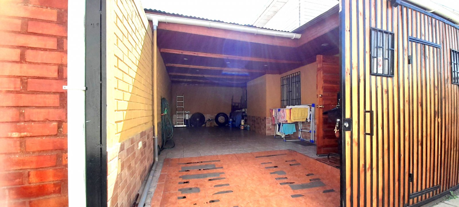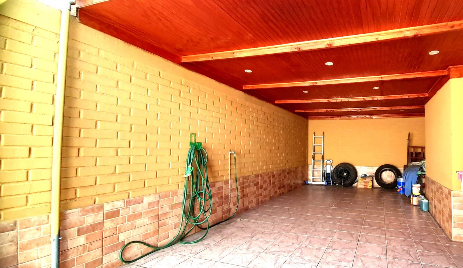 Patio terraza , techado con bigas a la vista, de madera y entrada de auto.