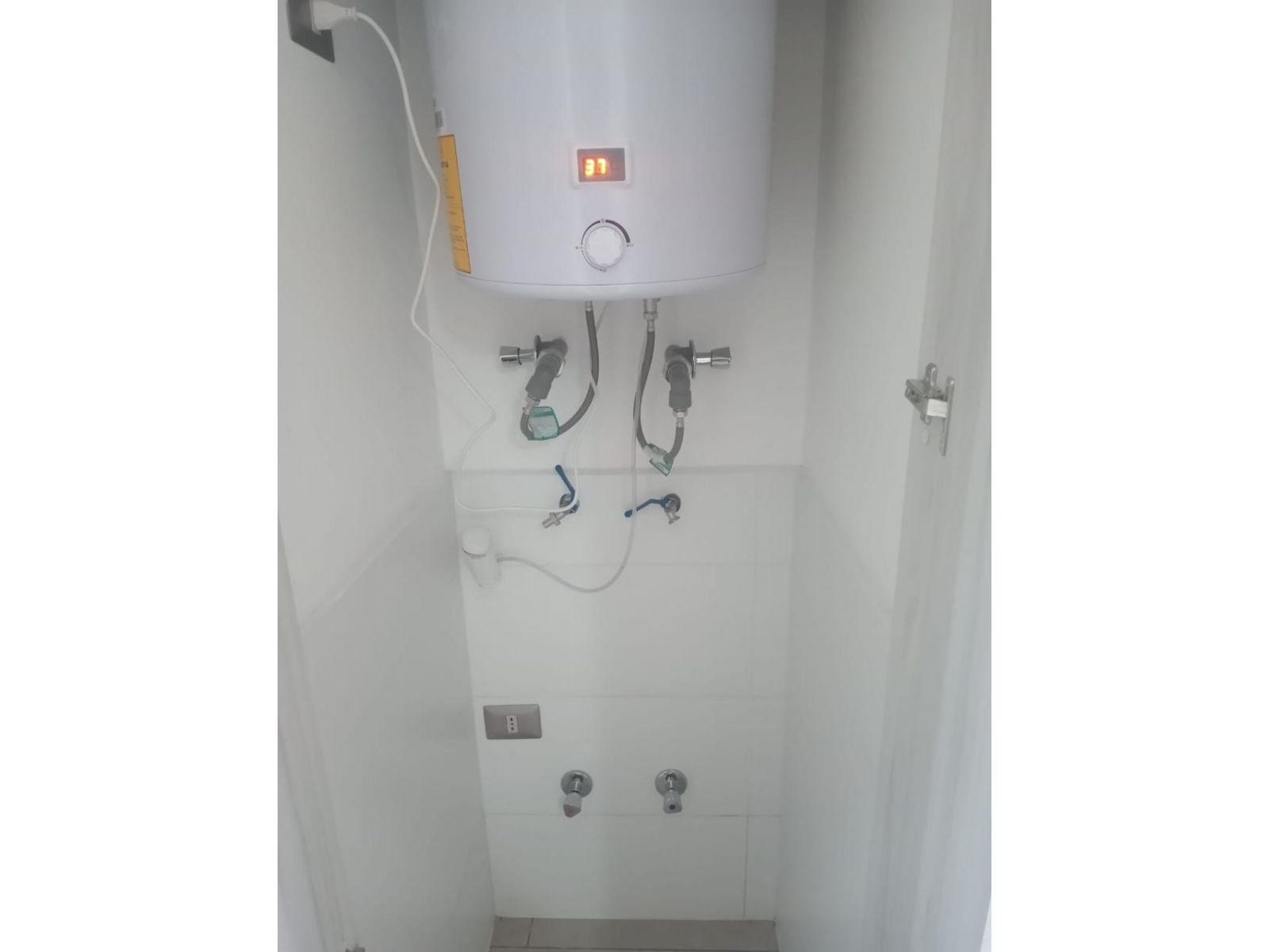 • Baño con vanitorio de loza moldeada, mueble suspendido y showerdor