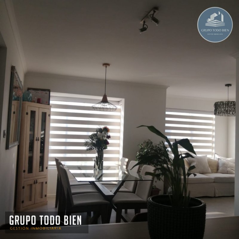 La cocina destaca por su amplitud y diseño moderno, equipada con encimera, horno, campana y un práctico mesón isla que conecta con el living-comedor, ideal para compartir momentos en familia.