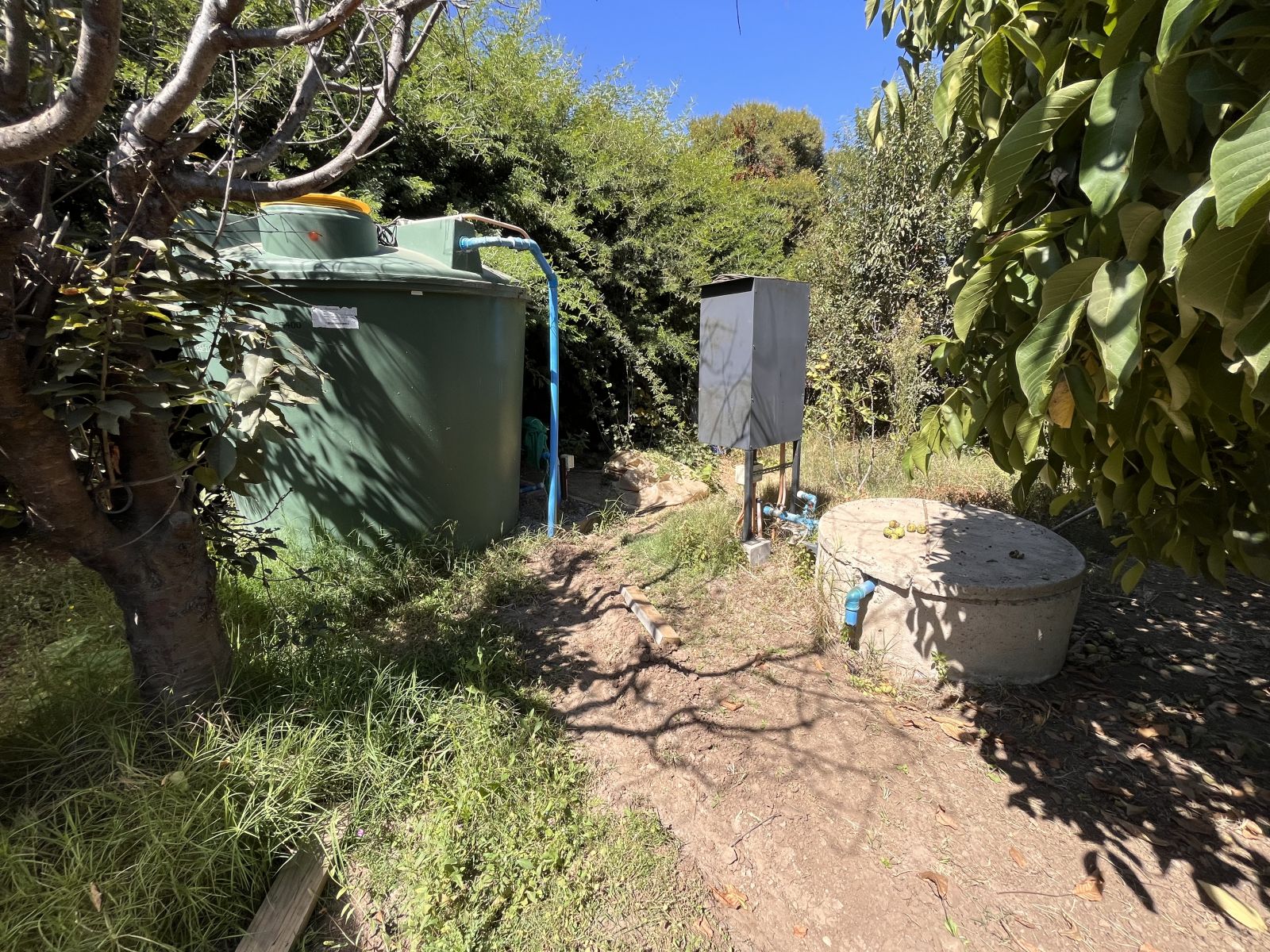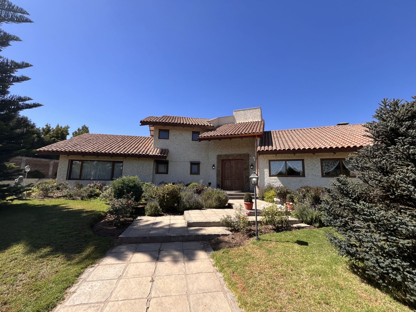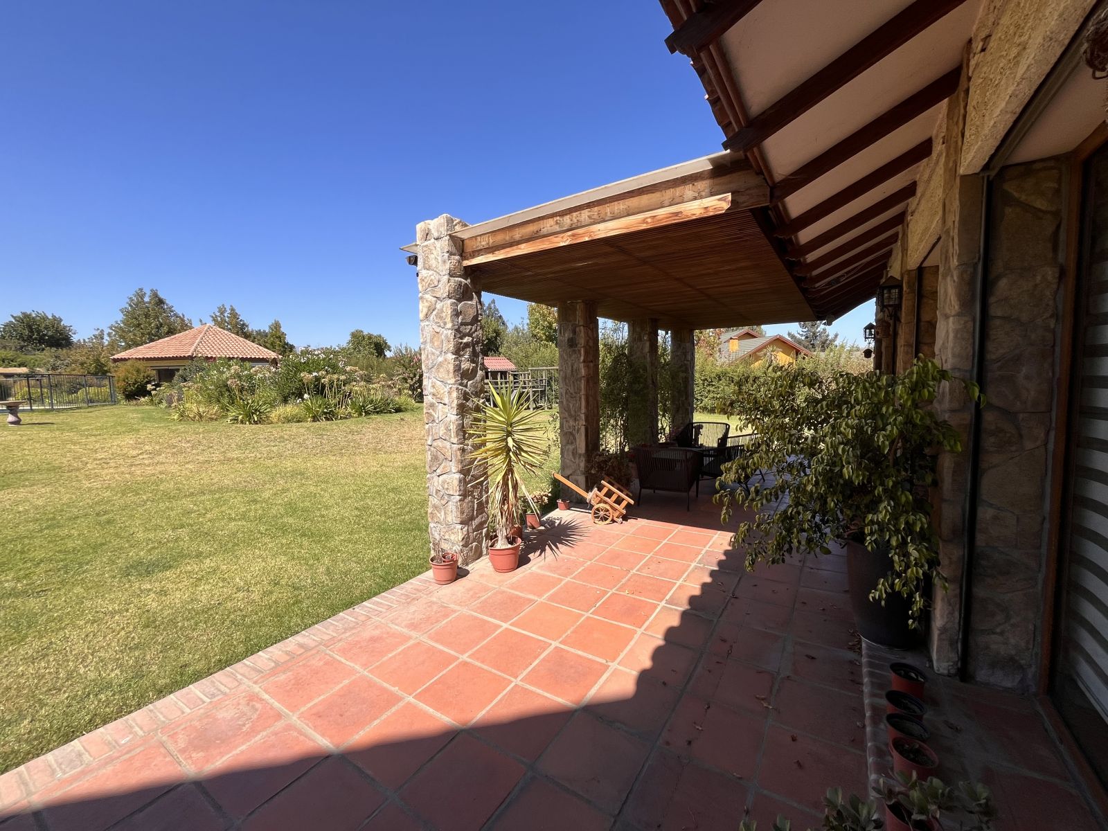 Tiene un gran patio y antejardín con prado y árboles. En el patio se encuentra una piscina, quincho cerrado para usar todo el año, sauna y baño con ducha, juegos infantiles, una pérgola con un horno de barro y un sector independiente con árboles frutales, invernadero y pozo profundo con bombas y estanques de almacenamiento. Además, tiene estacionamiento para 4 vehículos (dos techados), dos bodegas y baño jardinero.