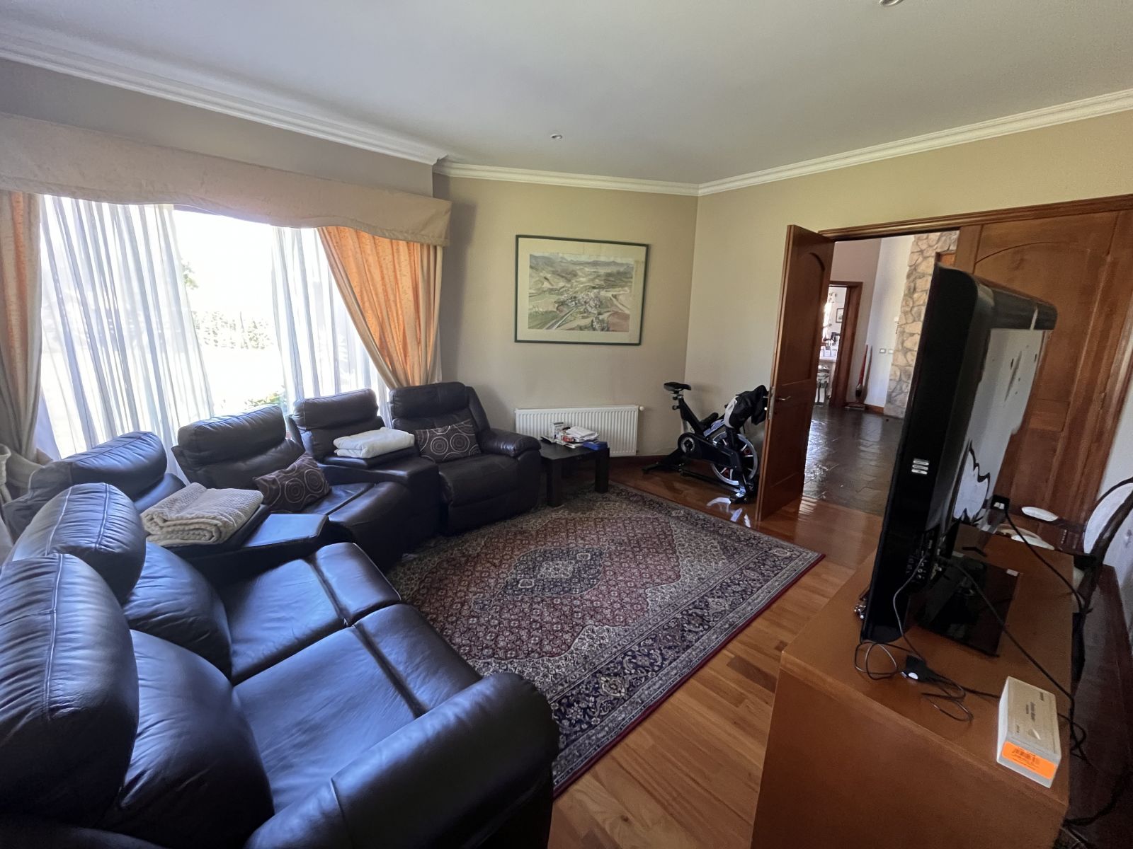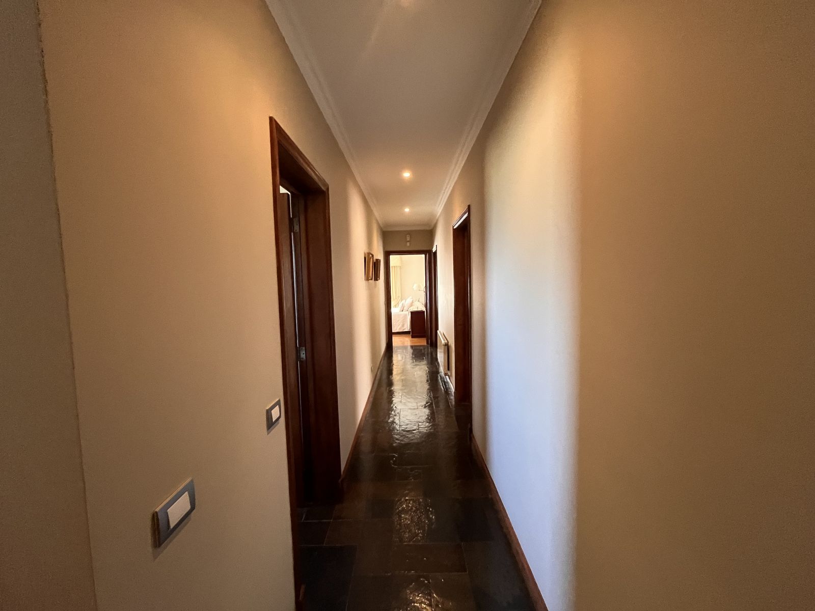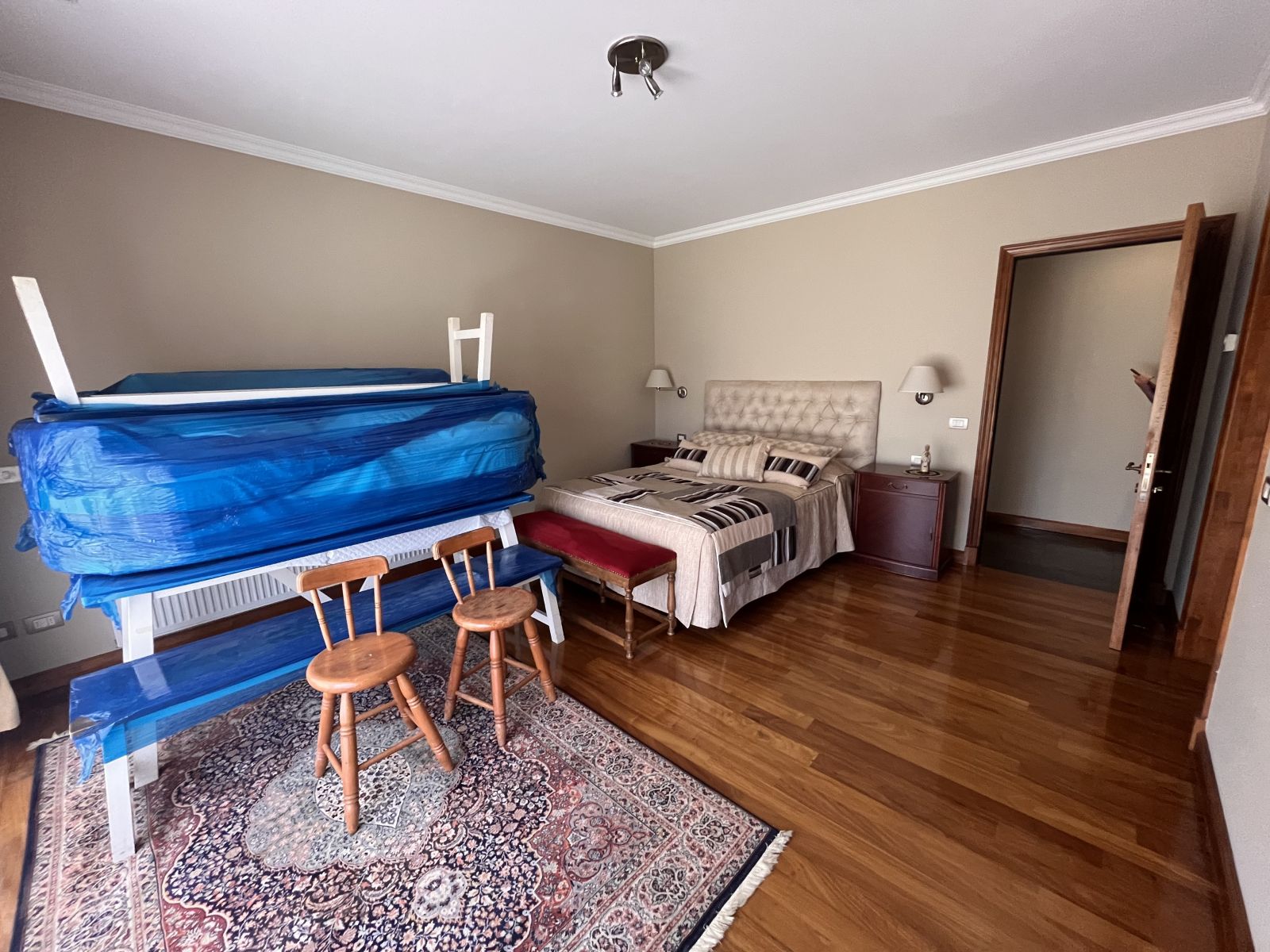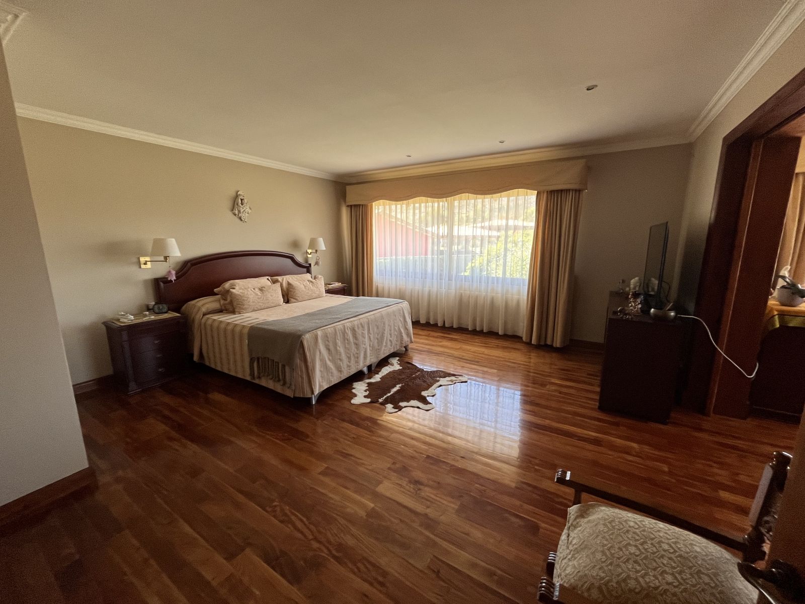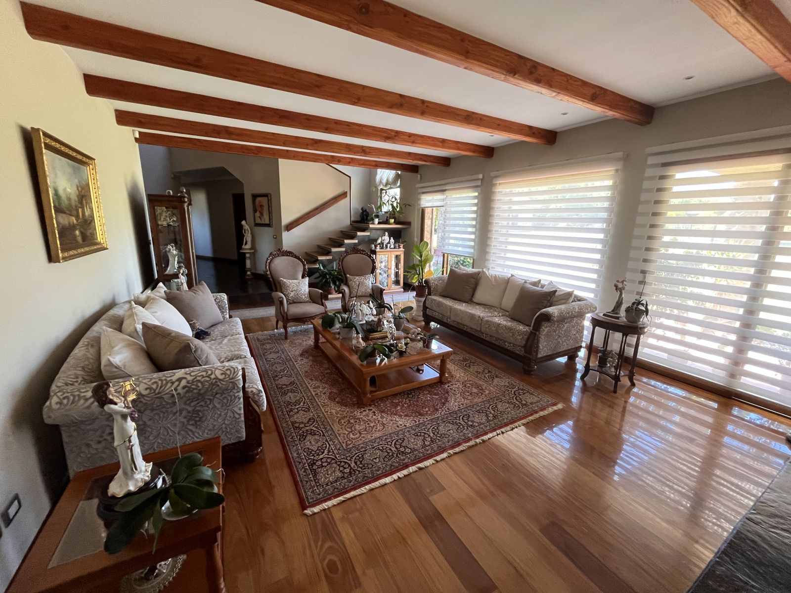 La casa es muy amplia y tiene dos pisos. Cuenta con 4 dormitorios, todos en suite y con walking closet, más servicios completos y baño de visitas. En el segundo piso se encuentra el dormitorio principal que tiene sala de estar y salida a terraza con vista al patio. Hall de acceso de doble altura. Living comedor separados por una chimenea y con salida a terraza techada. Sala de estar. Cocina independiente con comedor de diario, amoblada con cubiertas de granito negro y equipada con campana, encimera y horno eléctricos. Logia independiente. Calefacción por radiadores y ventanas termopanel en toda la casa, con persianas de seguridad metálicas en las del primer piso. Piso de madera en living comedor y dormitorios y piedra pizarra en zonas de circulación y baños.