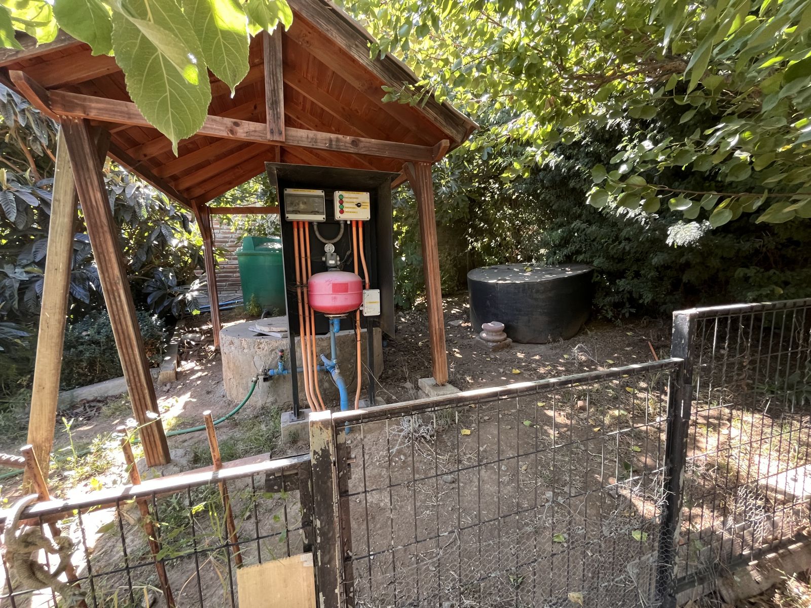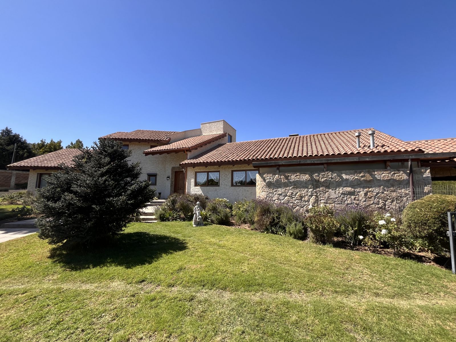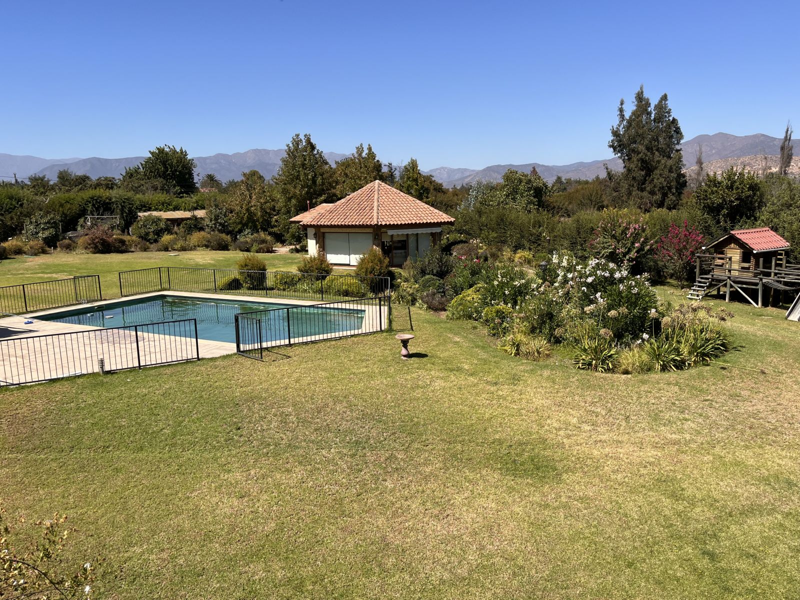 Tiene un gran patio y antejardín con prado y árboles. En el patio se encuentra una piscina, quincho cerrado para usar todo el año, sauna y baño con ducha, juegos infantiles, una pérgola con un horno de barro y un sector independiente con árboles frutales, invernadero y pozo profundo con bombas y estanques de almacenamiento. Además, tiene estacionamiento para 4 vehículos (dos techados), dos bodegas y baño jardinero.