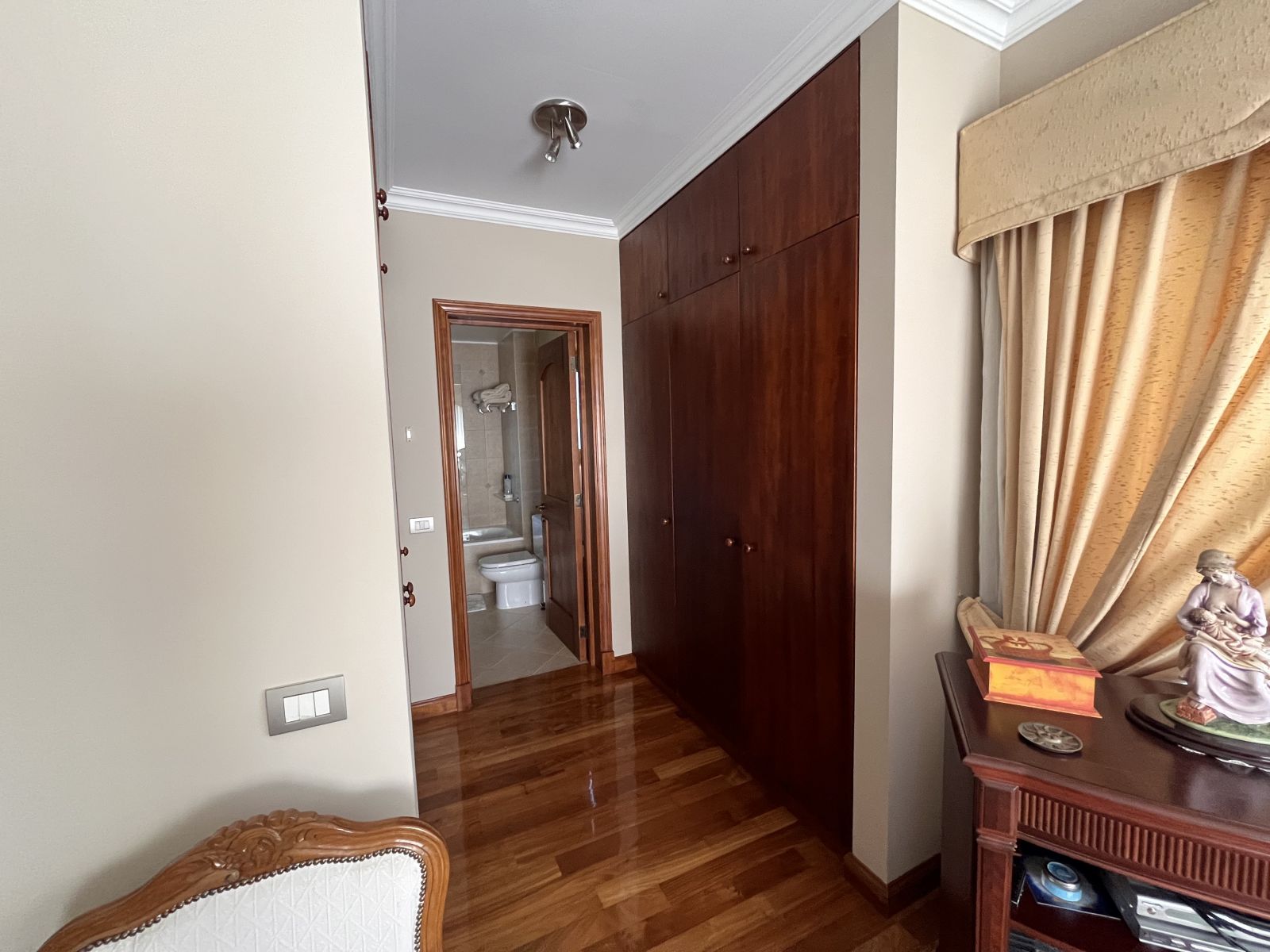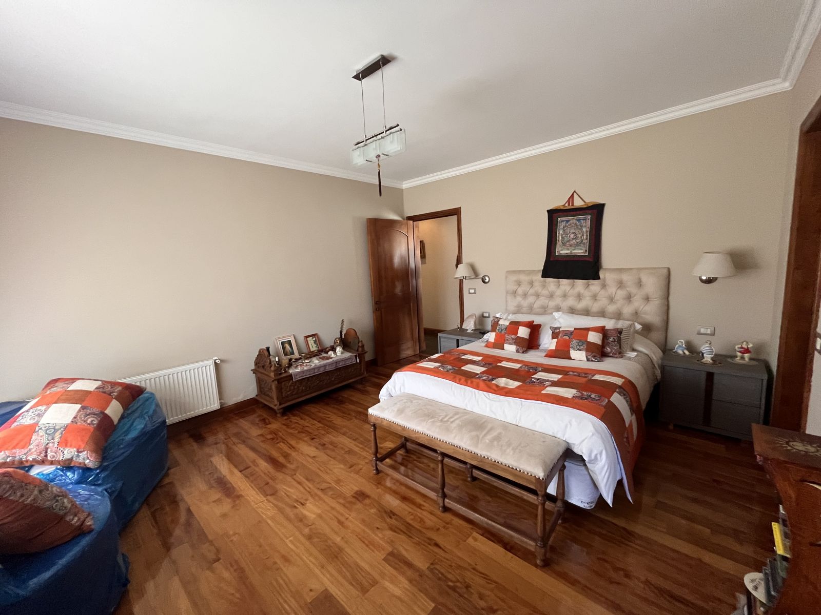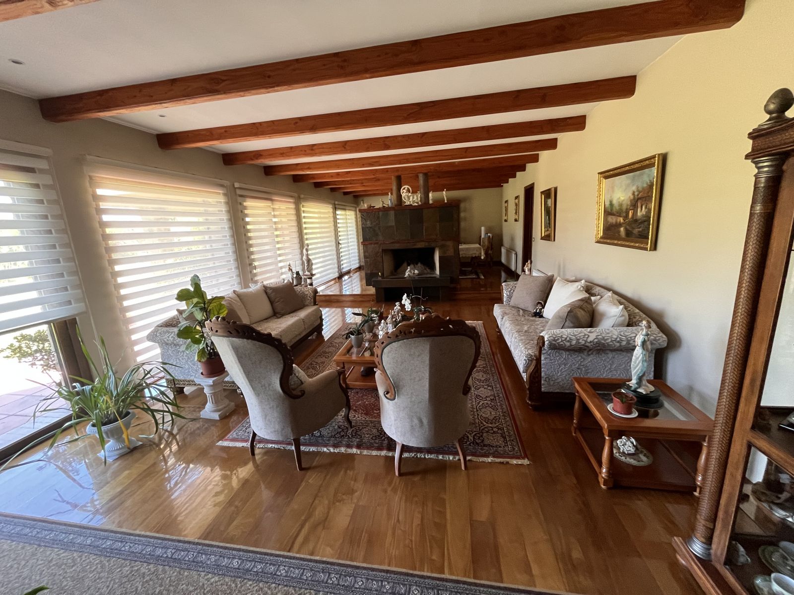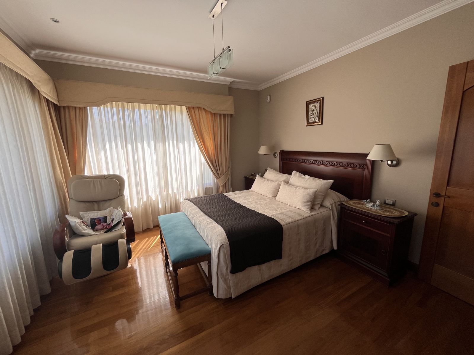 La casa es muy amplia y tiene dos pisos. Cuenta con 4 dormitorios, todos en suite y con walking closet, más servicios completos y baño de visitas. En el segundo piso se encuentra el dormitorio principal que tiene sala de estar y salida a terraza con vista al patio. Hall de acceso de doble altura. Living comedor separados por una chimenea y con salida a terraza techada. Sala de estar. Cocina independiente con comedor de diario, amoblada con cubiertas de granito negro y equipada con campana, encimera y horno eléctricos. Logia independiente. Calefacción por radiadores y ventanas termopanel en toda la casa, con persianas de seguridad metálicas en las del primer piso. Piso de madera en living comedor y dormitorios y piedra pizarra en zonas de circulación y baños.