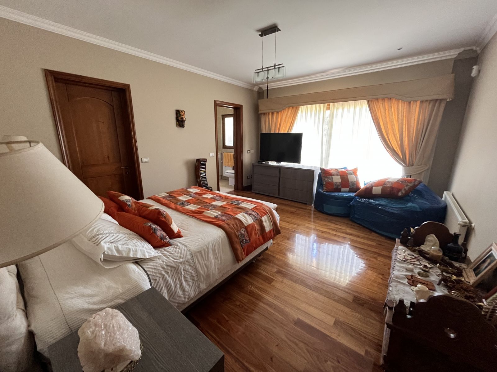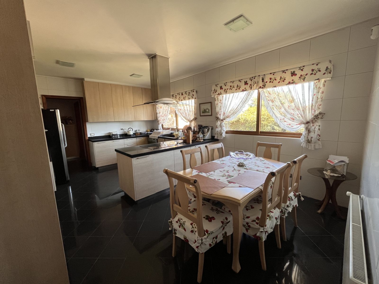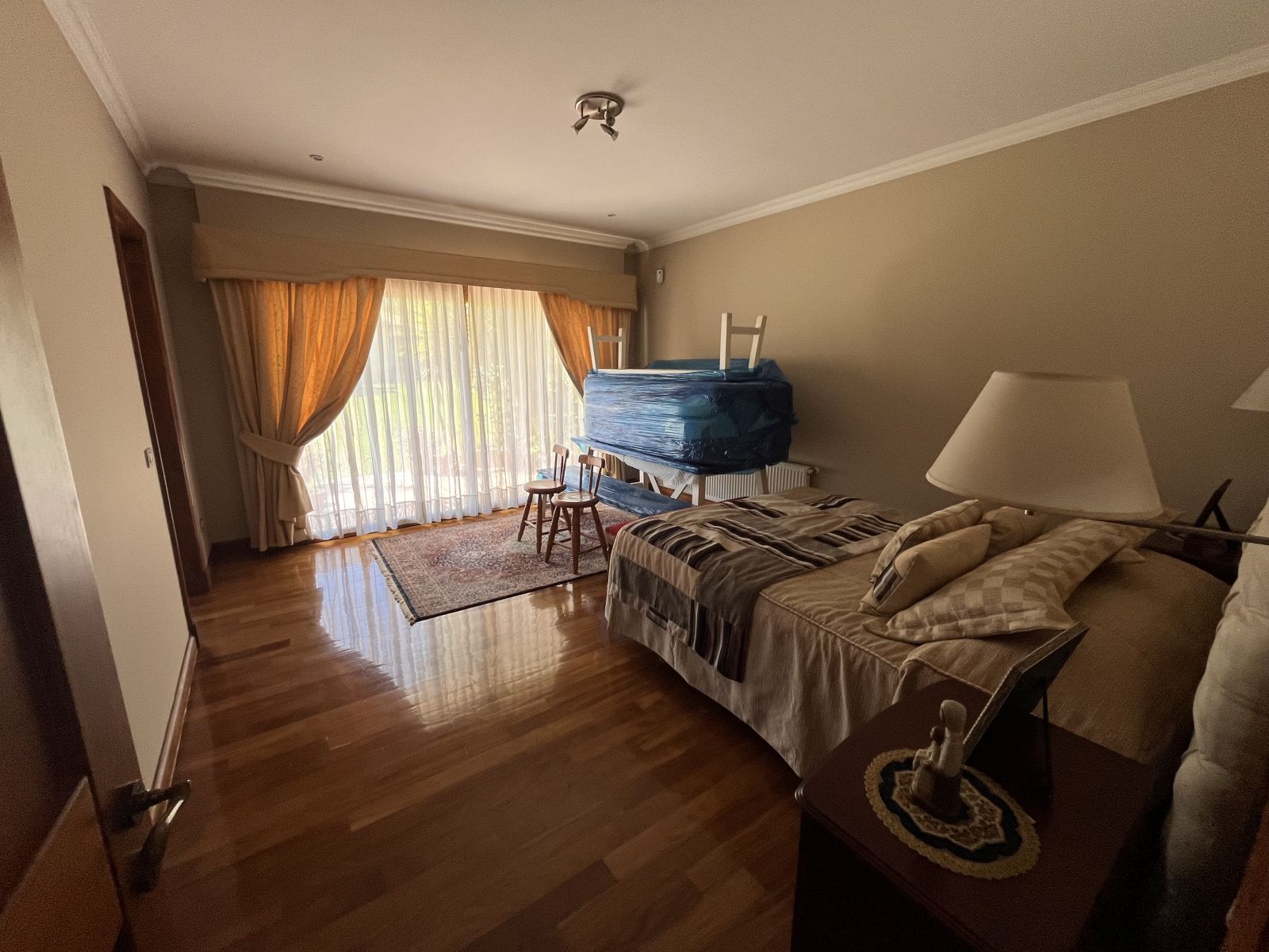 La casa es muy amplia y tiene dos pisos. Cuenta con 4 dormitorios, todos en suite y con walking closet, más servicios completos y baño de visitas. En el segundo piso se encuentra el dormitorio principal que tiene sala de estar y salida a terraza con vista al patio. Hall de acceso de doble altura. Living comedor separados por una chimenea y con salida a terraza techada. Sala de estar. Cocina independiente con comedor de diario, amoblada con cubiertas de granito negro y equipada con campana, encimera y horno eléctricos. Logia independiente. Calefacción por radiadores y ventanas termopanel en toda la casa, con persianas de seguridad metálicas en las del primer piso. Piso de madera en living comedor y dormitorios y piedra pizarra en zonas de circulación y baños.