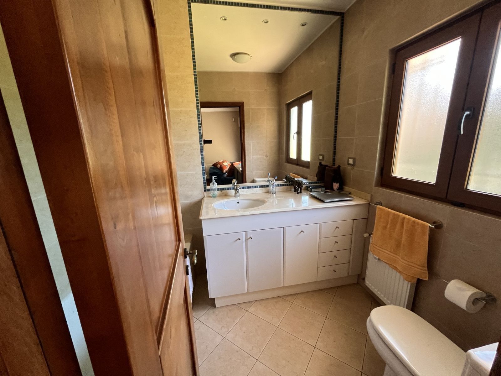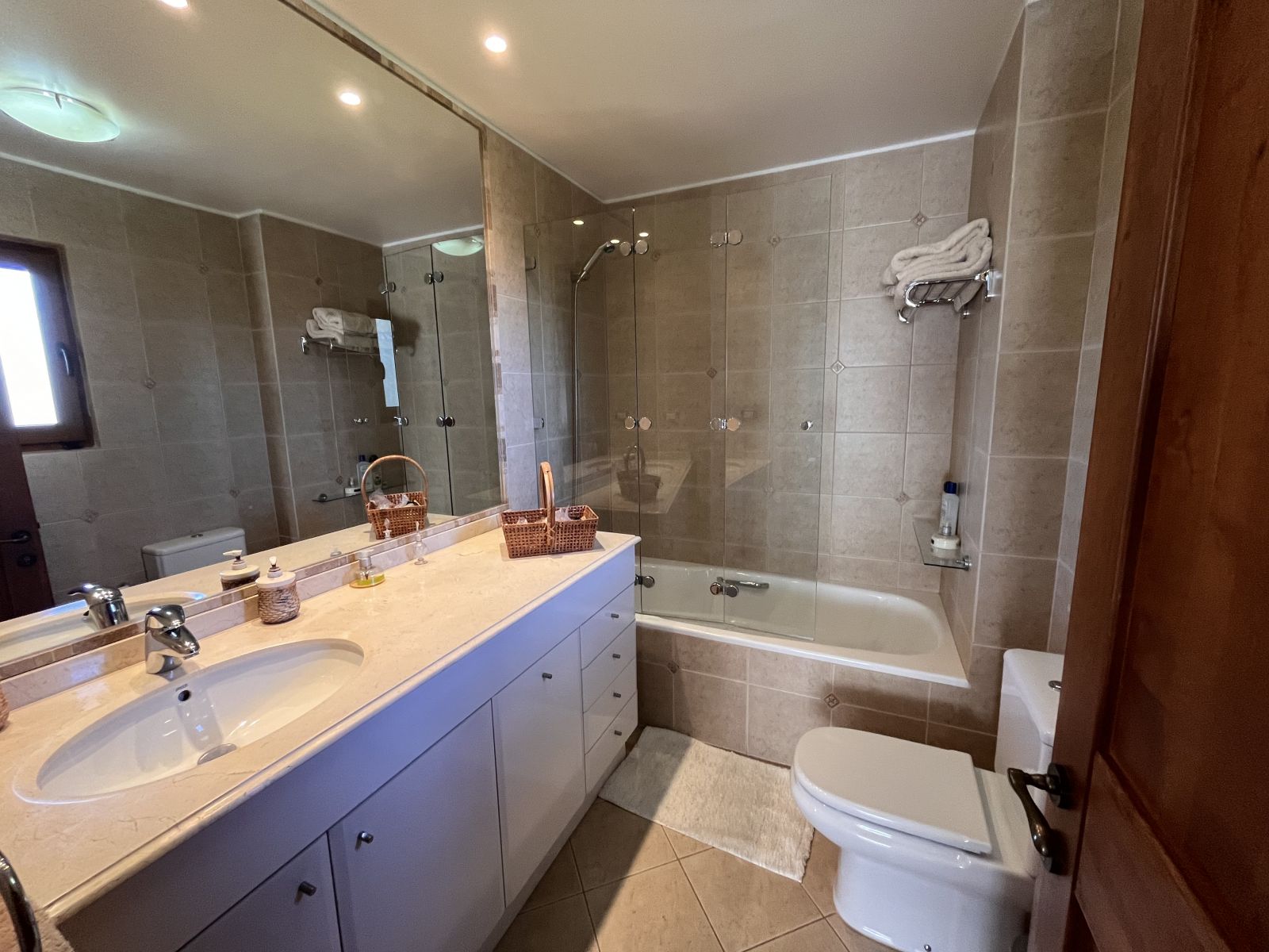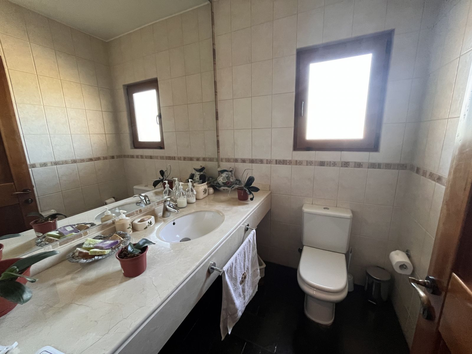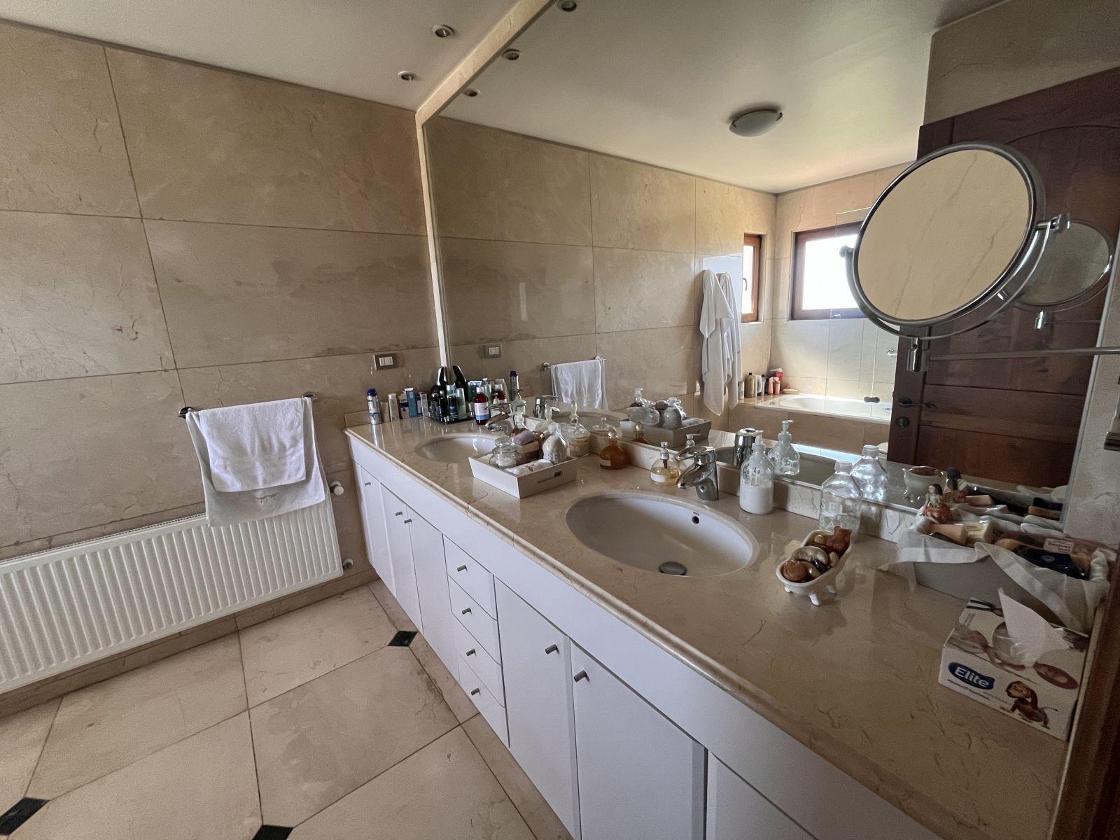 La casa es muy amplia y tiene dos pisos. Cuenta con 4 dormitorios, todos en suite y con walking closet, más servicios completos y baño de visitas. En el segundo piso se encuentra el dormitorio principal que tiene sala de estar y salida a terraza con vista al patio. Hall de acceso de doble altura. Living comedor separados por una chimenea y con salida a terraza techada. Sala de estar. Cocina independiente con comedor de diario, amoblada con cubiertas de granito negro y equipada con campana, encimera y horno eléctricos. Logia independiente. Calefacción por radiadores y ventanas termopanel en toda la casa, con persianas de seguridad metálicas en las del primer piso. Piso de madera en living comedor y dormitorios y piedra pizarra en zonas de circulación y baños.